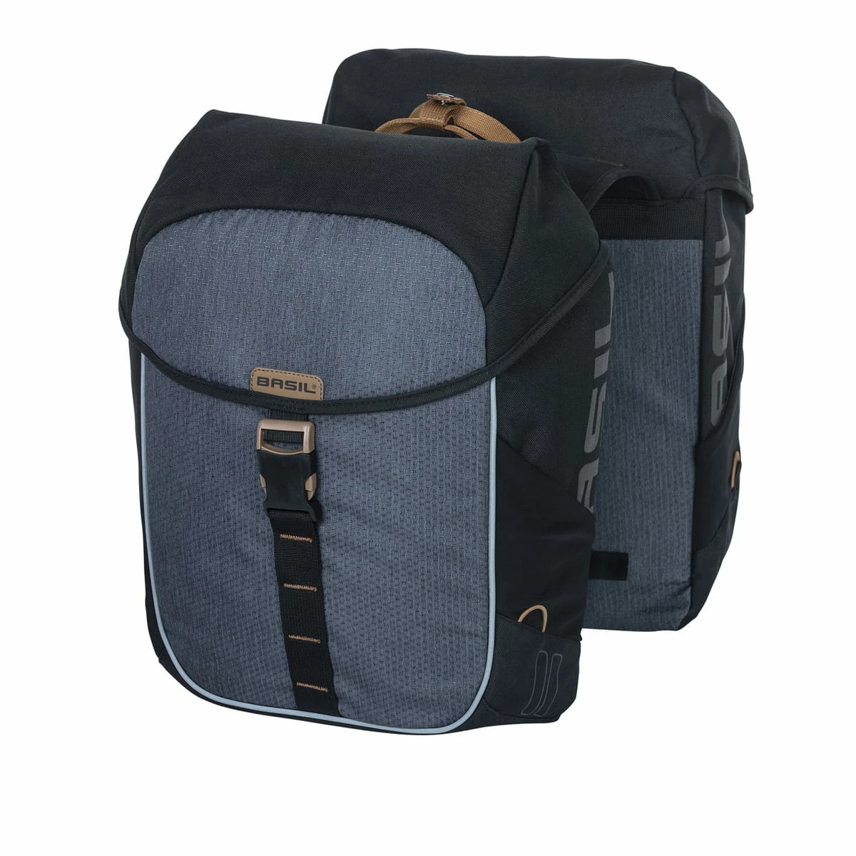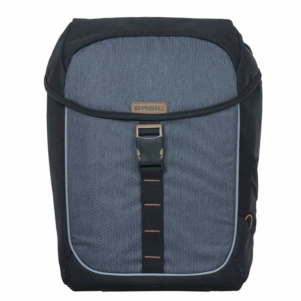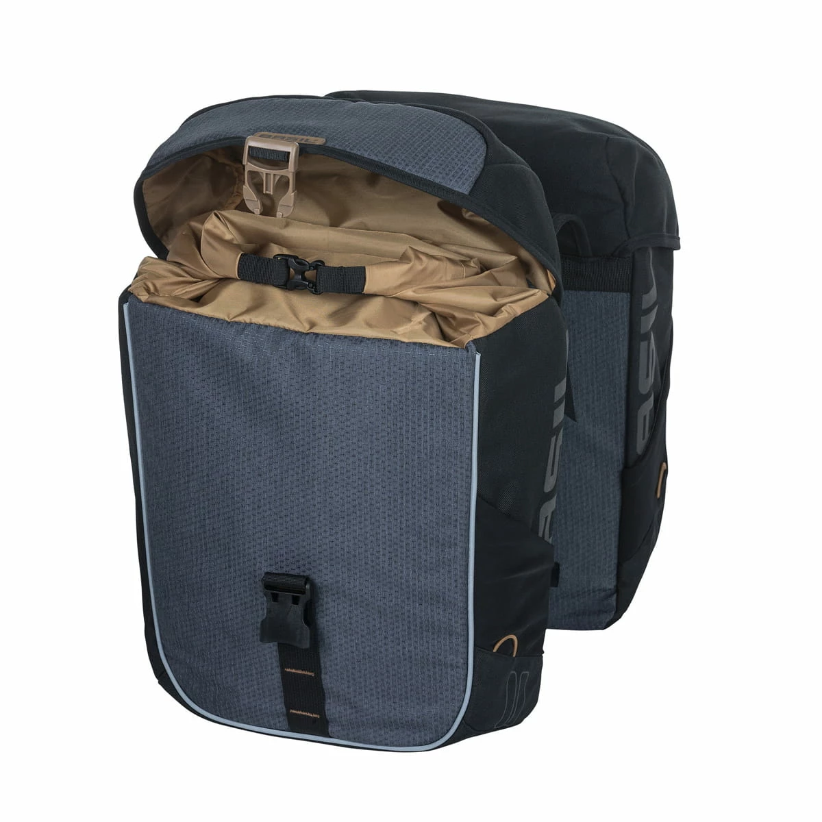 The Basil Miles Double Bag is a waterproof double bag with a large capacity of 34 liters. Grocery shopping or cycling through the Ardennes, this bag makes cycling easier and fun. The dark grey / anthracite and brown details give this bag your signature style. When it rains, the waterproof material ensures that the contents of the bag stay dry. From Basil fits the universal bridge system of the bag on the rack (including e-bike) and with one to two handles can be combined with the i-Rack of Racktime. The reflective details help to be more visible in the dark. It is also thought of a mounting option for LED lighting. The double bag closes with the help of a roll closure and push button, and has a solid inner lining. Thoughtful design in a fashionable design and she is ideal for shopping, for bike ride, leisure, or the way to work.