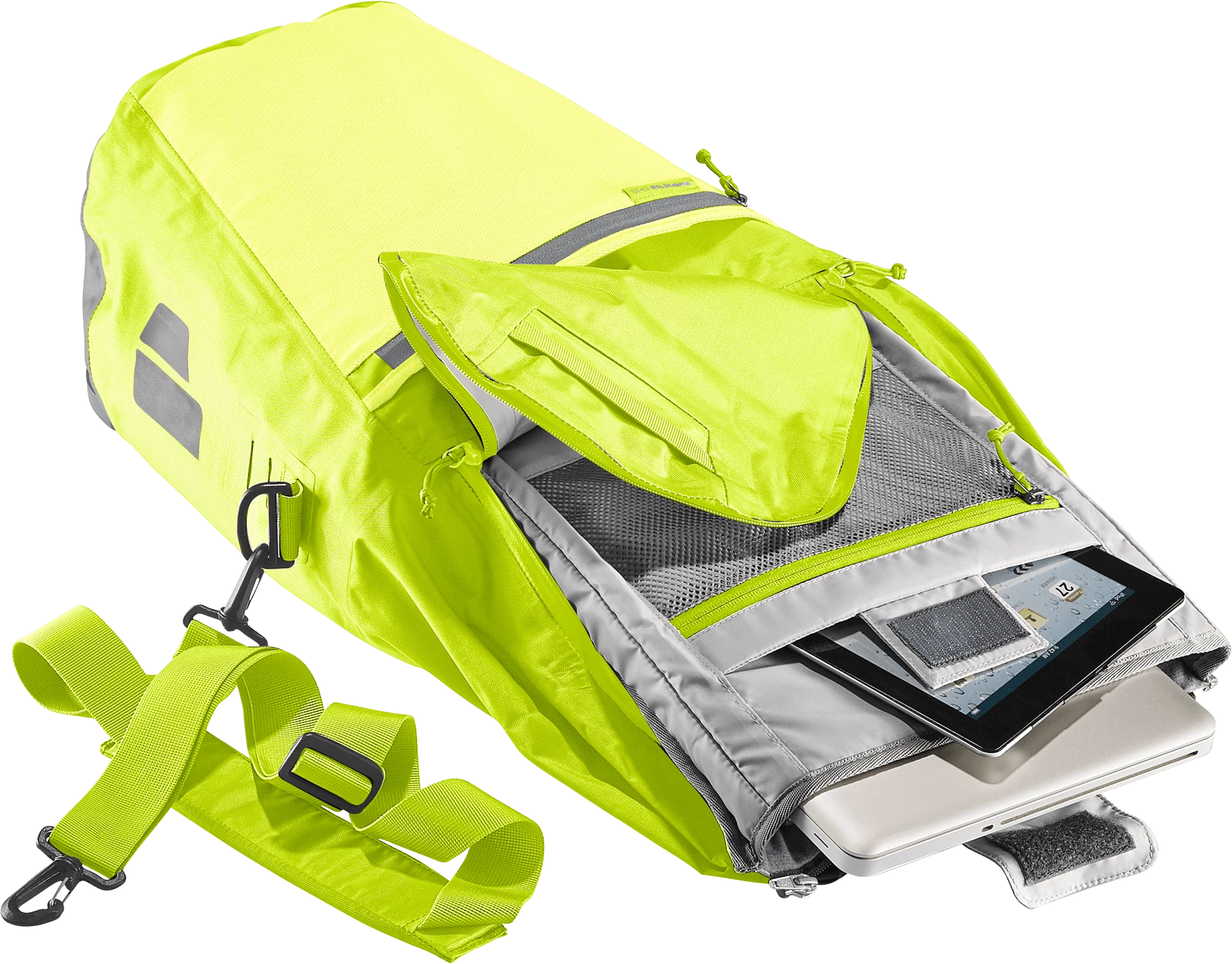 Flexibility offers the multifunctional bag through its different uses as a pure storage bag on the rear wheel or as a larger shoulder bag to hang around. And if it’s time to go fast, can also be taken only the zippable organization unit for laptop, tablet and work documents.