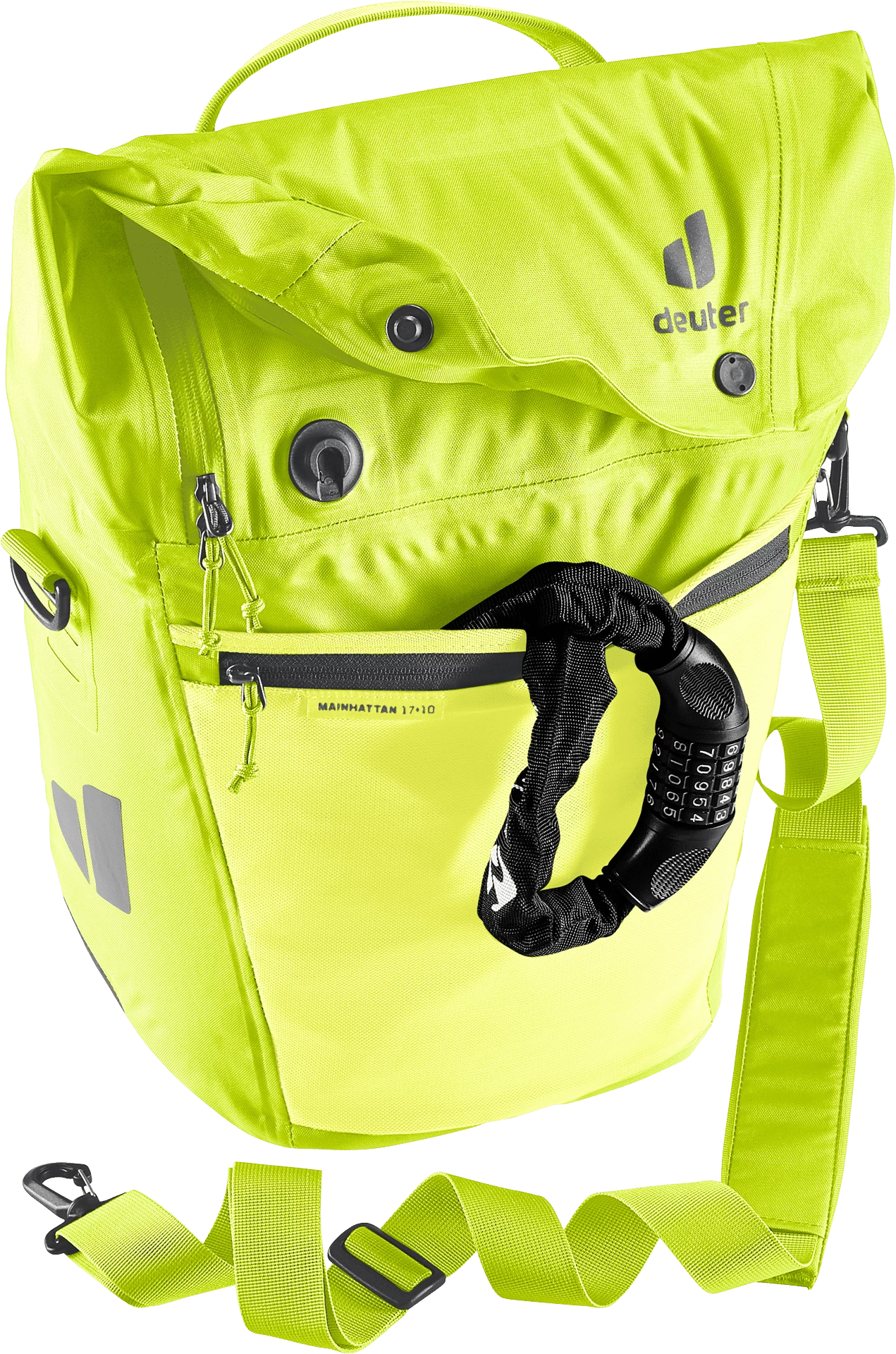 The waterproof bike bag keeps purchases, change of clothes and work materials safe from the penetration of moisture in the rain or splashing water. Thanks to the generous pocket flap with magnetic closures, the volume of this organizational talent can be expanded by an additional 10 liters of storage space.