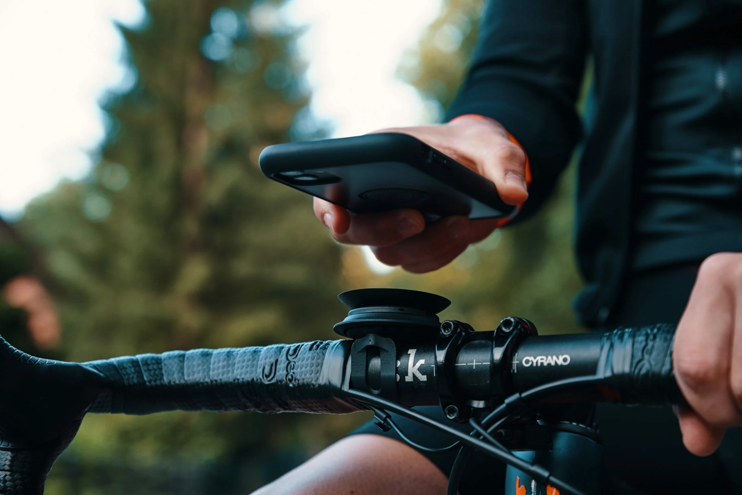 Thanks to the ingeniously simple combination of magnetic force and negative pressure, the smartphone can be operated with one hand and rotated 360 °, while a ball detent prevents twisting while driving – even on root trails!