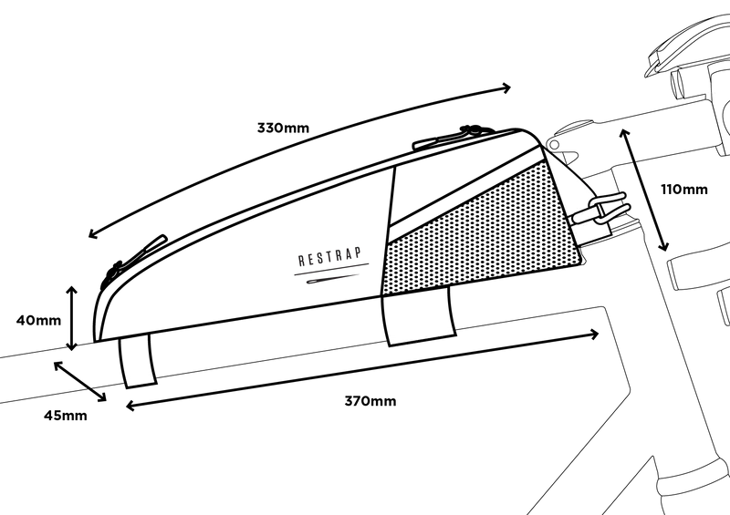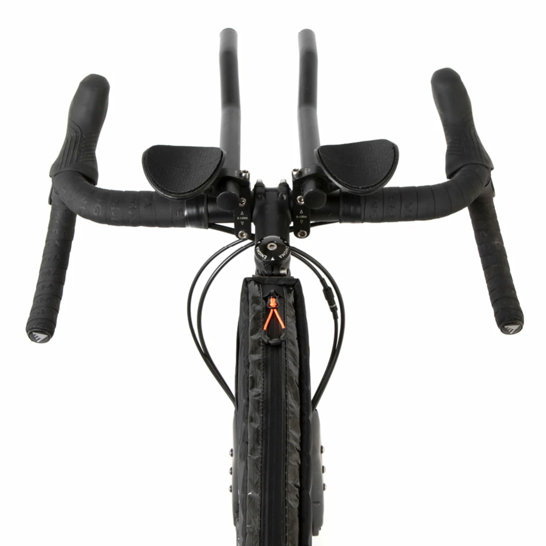 Practical and functional, the bag is held in place with a rubberized hook-and-loop closure and adjustable MOLLE Hypalon attachment, so it seamlessly pairs with all Restrap Frame Bags. A rigid internal plastic structure keeps the bag upright and stable, and the universal headset mount accommodates all headset types, including those on bikes with a low stack height. An expandable mesh side pocket provides storage for food, wraps, and other essentials needed on the go.