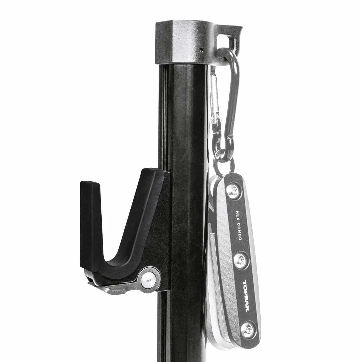 Extremely stable and at the same time portable bike stand for storage or maintenance of the drive. Rubberized & adjustable hooks* with quick-release fasteners made of aluminium grant an optimal and especially material-friendly adjustment to seat and chain stays. An extra large footprint provides extra stability – perfect for e-bikes, cargo bikes, heavy bikes and larger bike frames. With integrated key ring to store a mini-tool, such as the Hex Combo, always at hand.