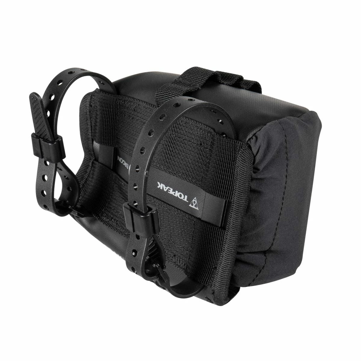 Compact frame bag with clear organization through division into three areas and internal organizers for rattle-free transport of emergency equipment for MTB or gravel bikes. Tool-free mounting on many positions of the frame by means of scratch-free straps.